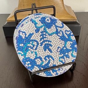 Add a touch of sparkling elegance to your table décor with this handcrafted blue floral diamond art coaster set. Each coaster features detailed blue and white floral designs set on a durable acrylic base with protective cork backing to help guard surfaces from moisture and scratches.
