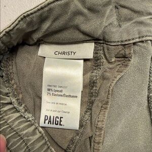These pants are lightly used, with mild wear and tear, and overall in great condition! These are a pair of green jogger style khaki pants by the brand Paige in a size 25! They are in the Christy design! Measurements are as pictured! Comes from a non-smoking household!