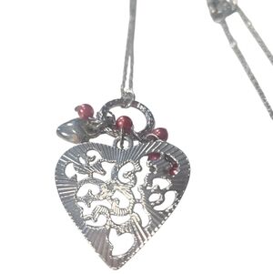 This elegant silver heart pendant necklace features intricate detailing and subtle red accents. Perfect for adding a touch of sophistication to any outfit.