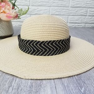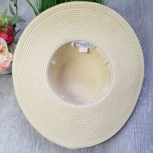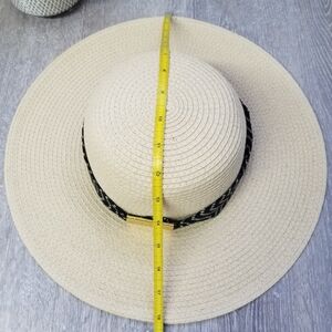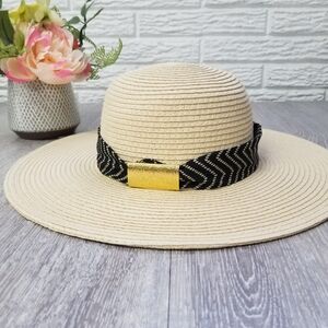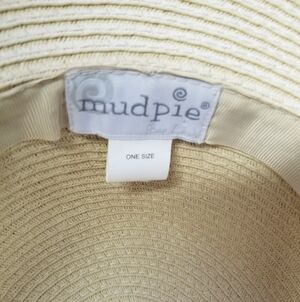 This is a gorgeous woven sun hat. Mud Pie brand means quality. One size. Woven hat is a cream color and it has a dainty scarf around with beautiful goldtone accent. One size. Perfect for beach, pool or vacation! Like new condition!