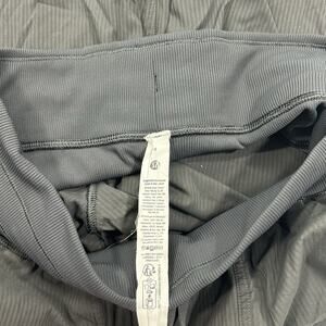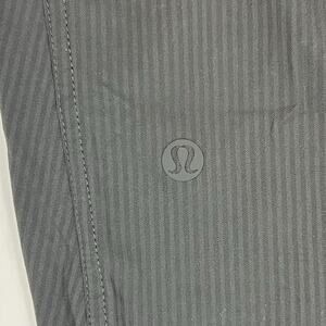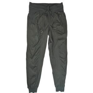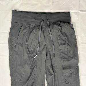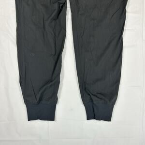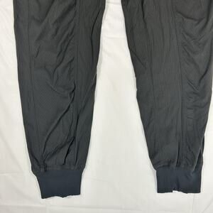 Lululemon size 4 jogger pants. These are a gray tone with a subtle textured stripe look and a clean athletic finish. The fabric is a lightweight nylon blend with stretch. They have a wide waistband with a drawstring, side pockets, and ribbed cuffs at the ankles for a jogger fit. Easy pair for workouts, travel, and everyday errands.