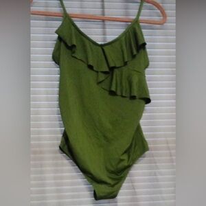 Elegant olive green swimsuit in excellent used condition. Unpadded built in shelf bra. The original tag said maternity and it has extra stretch around the tummy but the swimsuit ideal doesn’t say maternity. Also flattering if you aren’t pregnant.