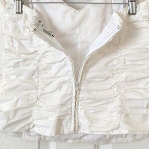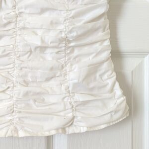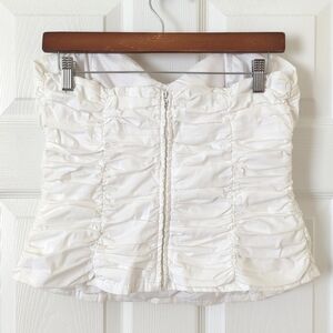 VTG and straight out of the early 00s - This beautiful white tube top features a classic strapless, form fitting silhouette with a fully ruched bodice, a sweetheart neckline, padded cups, and a zipper closure up the back! It is lightweight, breathable and comfortable, making it perfect for Spring and Summer! Pairs well with anything from high rise jeans to skirts, the possibilities are endless as this is an extremely versatile retro piece! Flattering, flirty and fun! High quality!