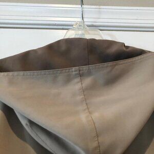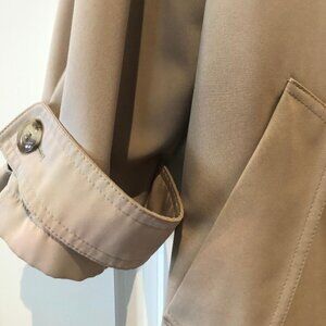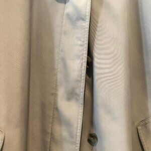 This is a beige colored raincoat or all weather coat with darker beige hood (Hood is NOT removable). It is in perfect condition. Frint pockets and buttons hidden under front placard.