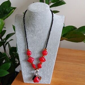 This elegant necklace features striking red beads complemented by black accents. Perfect for adding a touch of sophistication to any outfit . (374j0