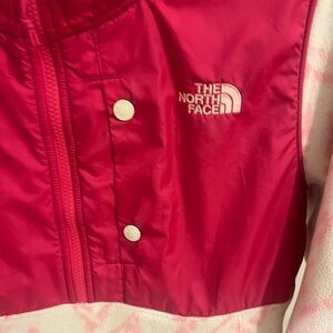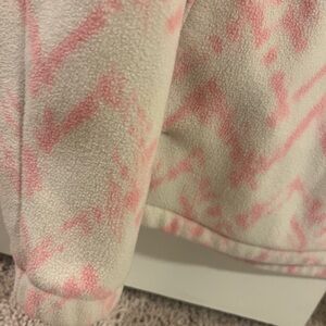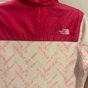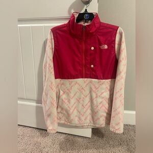 Warm and stylish puffer jacket. Red top with cream and pink pattern. Perfect for chilly days. Overall, in good condition, size medium woman’s would also fit size small for women women’s for a looser fit very warm.