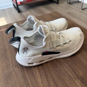 Women’s On Cloud Easy sneakers in white. Lightweight, breathable knit upper with elastic lace system for easy slip-on wear. Features On’s CloudTec cushioning for all-day comfort and a flexible, supportive sole. Great for casual wear, travel, walking, or everyday comfort.