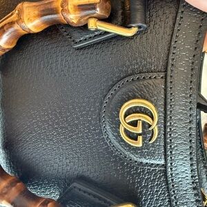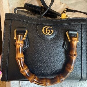Chic Gucci small Diana tote in black leather. Features gold hardware and bamboo handles. Stylish and versatile.