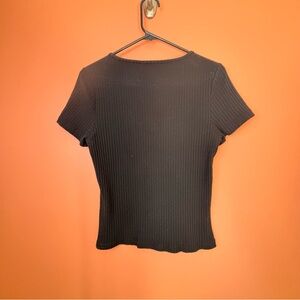 Stylish black ribbed shirt with button-down front. Short sleeves and scoop neckline. Ideal for casual or dressy looks.