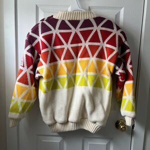 Vibrant sweater with geometric patterns. A beautiful vintage piece in excellent condition! Has a polyester lining so it’s not itchy to wear. Very thick and warm. Has shoulder pads.