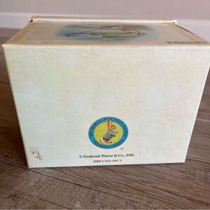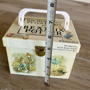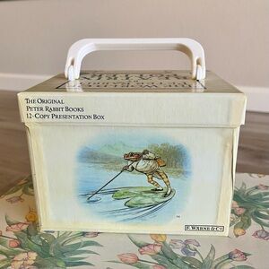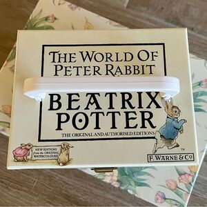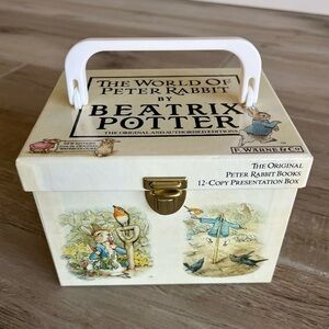 Cardboard box covered with illustrated glazed white paper; white plastic handle and gilt clip on lid. Box 1988 Books 1987. Box contains 12 hardcover The Tale of Peter Rabbit, The Tale of Squirrel Nutkin, The Tailor of Gloucester, The Tale of Benjamin Bunny, The Tale of Two Bad Mice, The Tale of Mrs. Tiggy Winkle, The Tale of Mr. Jeremy Fisher, The Tale of Tom Kitten, The Tale of Jemima Puddle-Duck, The Tale of The Flopsy Bunnies, The Tale of Mrs. Titlemouse, and The Tale of Timmy Tiptoes.