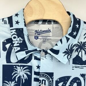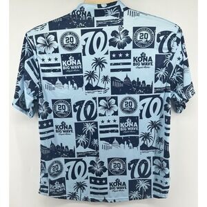 The Washington Nationals X Kona Big Wave 20th Anniv Hawaiian Shirt is a men's XL button-up shirt with a graphic print featuring the Washington Nationals team logo and a Hawaiian beach theme. Made from polyester knit fabric, this shirt is designed for casual wear and is machine washable. It has a collared neckline, short sleeves, and a regular fit, making it perfect for travel, parties, or everyday wear. The blue color and spread collar style add a touch of baseball and Hawaiian flair to the overall design, making it a unique and stylish addition to any man's wardrobe.