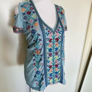 Johnny Was Embroidered open shoulder cotton top Blouse