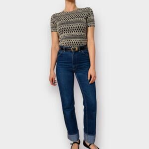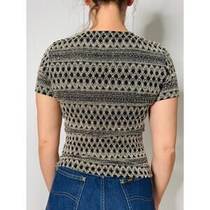 90s short sleeve high round collar top. Stretchy, black and cream textured material.