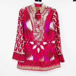 Tory Burch Iveta Embellished Ikat Silk Tunic Top Pink Red Resort Womens Size 2