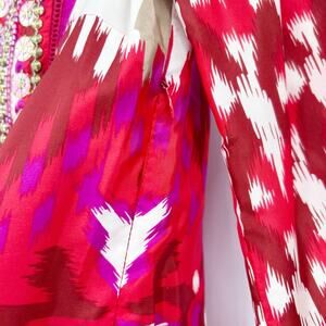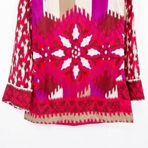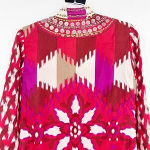 Tory Burch Iveta womens top in multicolored ikat print. Gorgeous Tory Burch silk tunic top featuring a vibrant pink, red, magenta, and ivory ikat-inspired print with ornate embellished neckline. Designed with a split V-neck, decorative metallic and bead detailing, long sleeves with patterned cuffs, and a flattering tunic-length silhouette. Lightweight 100% silk with a side zip closure for easy wear. A standout piece perfect for resort wear, festivals, or elevated everyday styling. Size 2. Excellent used condition. No flaws detected. See measurements for proper fit.