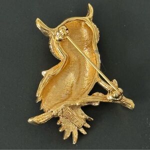Vintage Monet owl pin with faux emerald eyes. This beautiful piece is made of goldtone metal and measures 1 1/2 inches in size. The unique design of this owl pin makes it a great addition to any jewelry collection. It is stamped with the Monet brand name, ensuring its authenticity. The owl pin is perfect for adding a touch of whimsy to any outfit and would make a great gift for any owl lover.