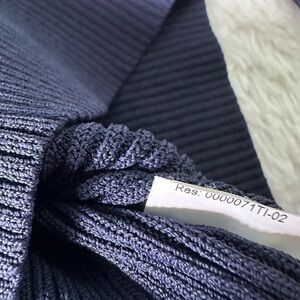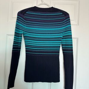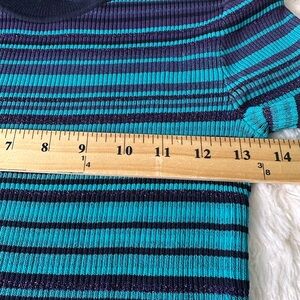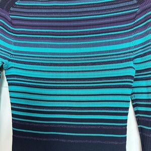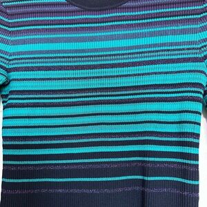 BOSS Hugo Boss lightweight ribbed knit sweater. Features a vibrant teal, purple, and navy striped pattern with subtle metallic shimmer throughout. Pit-to-Pit (Width): Approximately 13.5 to 14 inches (laying flat). slim cut, this is likely a Size Small (S) or a Size 4/6. "Size tag removed and care tag , please see measurements" in the description.