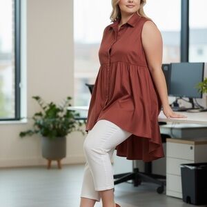 Brand new with tags Torrid sleeveless high-low tunic in a rich madder brown shade that’s basically fall sophistication bottled up. Lightweight poplin fabric with a flattering babydoll silhouette that drapes beautifully and skims without clinging (we love a forgiving queen 👑).