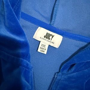 Luxurious royal blue velour jacket. Features a zip-up front and cozy hood. Perfect for casual wear.