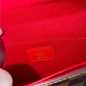 Stylish clutch with iconic checkered design. Features gold chain strap. Ideal for versatile use.