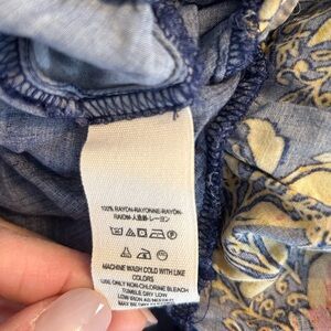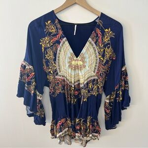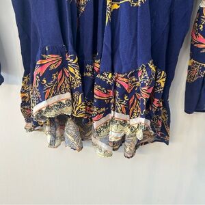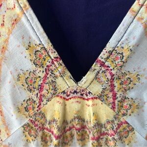 Free People Women’s Navy Blue, Gold, and Pink V Neck Sunset Dreams Tunic Top, Size XS.