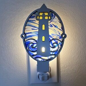 Handcrafted Lighthouse Night Light Coastal Nautical Ocean Waves Blue Yellow