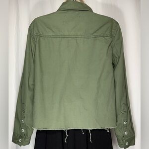 A stylish green utility jacket highlighted with bold red accents. It features a spread collar, front button closure, and front pockets. The sleeves have striped trim and button cuffs, while the chest features flap patch pockets with buttons—additional side slit pockets, a frayed hem, and an unlined interior finish the design.