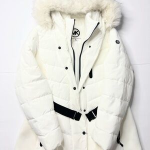 Chic white ski jacket with plush fur hood. Features black accents and secure zip pockets. Ideal for winter sports.