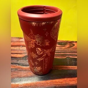 BrüMate tumbler in red with a festive gold holiday design. Perfect for keeping drinks hot or cold.