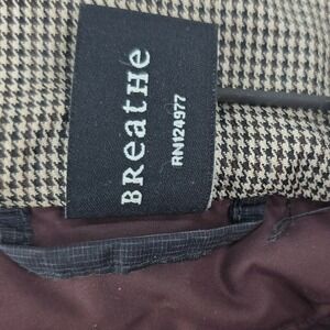 Prana Breathe hooded puffer jacket offers reliable warmth with a 90/10 down and feather insulation blend. This full-zip outerwear piece features a subtle pinstripe texture on the charcoal gray shell, complemented by a classic houndstooth lining within the hood. Functional details include a vertical zippered chest pocket and two side hand pockets, making it a versatile choice for cool-weather layering.