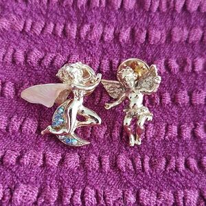 Vintage Kirks Folly set of two pins: One fairy with wings and iridescent pave accents in excellent used condition and one cherub in good used condition with an area of tarnish on the back/side. A little more that 1" long.