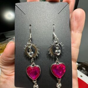 Elegant heart drop earrings featuring vibrant pink hearts and silver sunburst accents. Perfect for adding a touch of color and shine to any outfit.