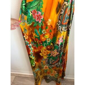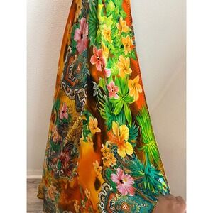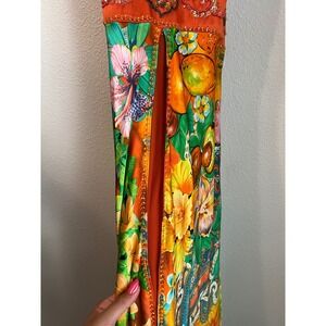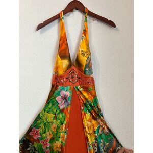 Keywords: maxi dress, halter dress, floral dress, bohemian dress, festival dress, summer dress, orange dress, green dress, tropical print, embellished dress, party dress, vacation dress, boho chic, statement dress