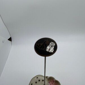 This antique hat pin features charming black-and-white enamel Scottie dogs, capturing the elegance of the early 1900s. It is a collectible treasure for enthusiasts.