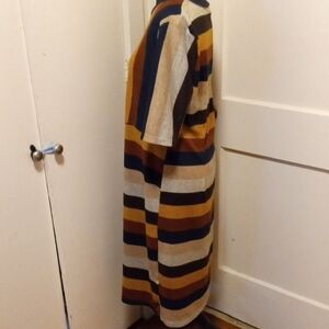 This stylish midi dress features bold stripes in a mix of colors, perfect for any occasion. The comfortable fit and vibrant design make it a must-have addition to your wardrobe.