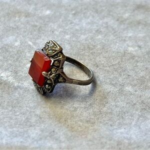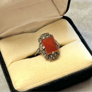 Vintage sterling silver ring in size 5 with a gorgeous carnelian stone surrounded by marcasite