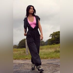 Take your styling game a level higher wearing the fp movement Fly By Night jumpsuit. Soft breathable Windbreaker material. Wrinkle free fabrication. Plunging scoop button up neckline and cap sleeves, side hand pockets, back patch pockets with signature detailing, adjustable elasticized tie accent for shape refining.