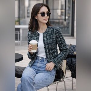 Timeless and polished, the Hugo Boss Jalay Cropped Tweed Blazer delivers effortless Parisian-inspired sophistication. Crafted from a textured cotton-blend tweed with subtle emerald threading, this piece features a collarless open-front design and delicate fringe trim along the edges and cuffs for a refined, feminine finish.