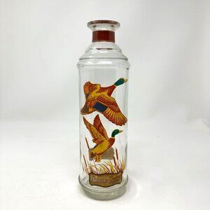 A charming collectible for bourbon enthusiasts, this vintage decanter features vibrant mallard duck artwork and an amber glass stopper. A unique display piece.