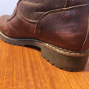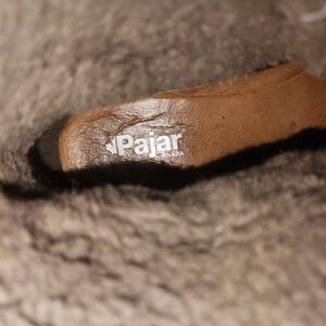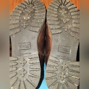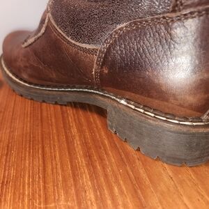 Weatherproof brown leather Pajar winter boots- shearling lined & very warm! Heavy lugg sole. Worn a handful of times- has some discoloration on sides that is hardly noticeable when worn. Zip front pull on style, can be worn rolled up or down. Hardy pair of boots with many miles left in them!