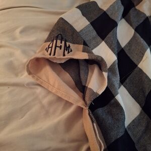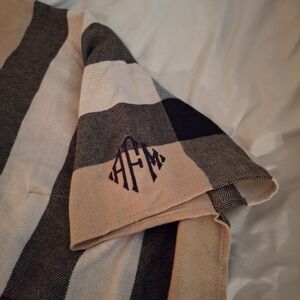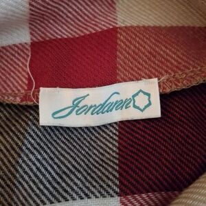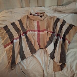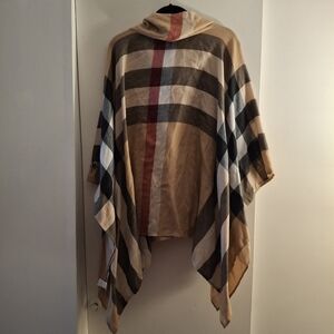 Chic plaid poncho with a cowl neck. Features a blend of tan, red, and black colors. size small. asymmetrical hem. measures 47 inches across. Length 28-31 inches.