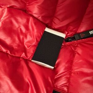 Stay warm and stylish with this vibrant red puffer jacket. This coat is a size medium and made by GUESS. IT combines comfort with a sleek design. 2 pockets that zip shut. Hood is attached. Guess logo is on the left sleeve, near shoulder.