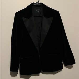Bold red pantsuit by Calvin Klein. Includes tailored blazer and wide-leg pants. Perfect for a chic, professional look.
