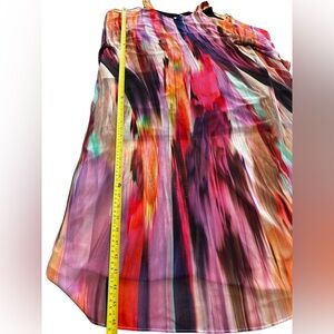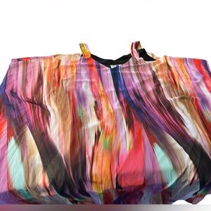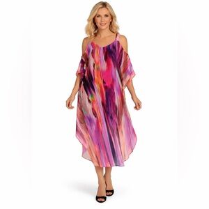 NWT Robbie Bee Signature cold-shoulder maxi dress in a vibrant, painterly abstract print. Features a flowing chiffon overlay with dramatic drape, open cold-shoulder cutouts, and a relaxed, caftan-inspired silhouette that moves beautifully with the body. Half lined through the body with soft stretch lining for comfort, while the sheer overlay adds an airy, elegant finish. Scoop neckline with wide straps and fluttering sleeves for a flattering, effortless fit. Machine washable and travel-friendly — perfect for statement occasions or resort wear.
