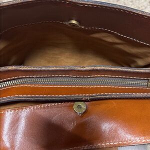 Structure: Features a center zip compartment, multiple interior slip/zip pockets, and a rear exterior slip pocket. This elegant brown leather handbag is perfect for any occasion. Its sleek design and high-quality material make it a must-have accessory. One small scratch so see pictures. Comes from a smoke free home.