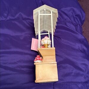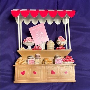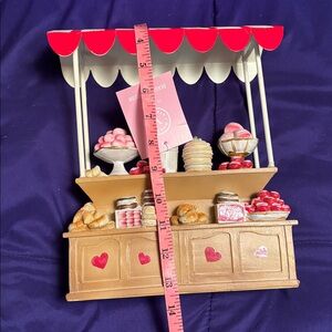 Charming red and white stand perfect for home parties. Features delightful decorative treats. Enhance your party decor with this eye-catching piece.