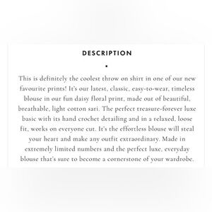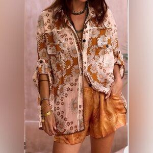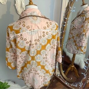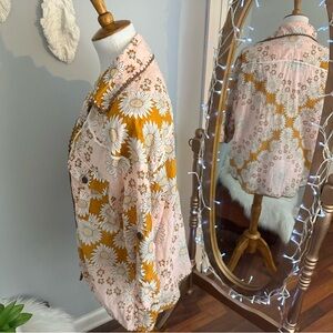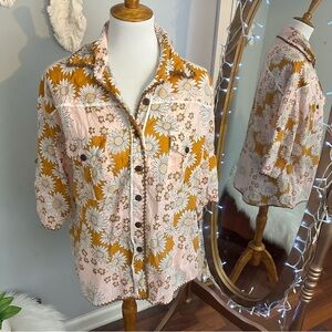 Stylish daisy floral button-down by Chasing Unicorns. Features a vibrant orange, pink, and cream daisy pattern. Throw this on for a day on the move, lounging around or as a coverup. Crochet details, button front and buttons on pockets. Optional roll sleeves. Excellent condition. Bust flat 23”. Length 26.5”