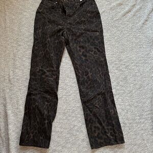 Classic 90s relaxed fit jeans. Features a muted leopard print. Comfortable and stylish.