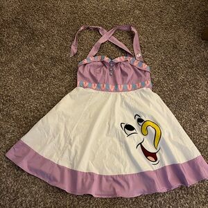 Adorable Disney dress with a fun character print. Features a charming purple and white color scheme.